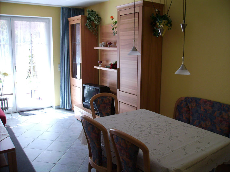 Das Wohnzimmer im Erdgeschoss ist der größte Raum des Hauses. Mit der gemütlichen Sofalandschaft und der Essecke bietet es ausreichend Platz zur Nutzung des Smart-TV oder für gemeinsame Mahlzeiten. Außerdem befindet sich hier der Zugang zur Terrasse mit Garten.